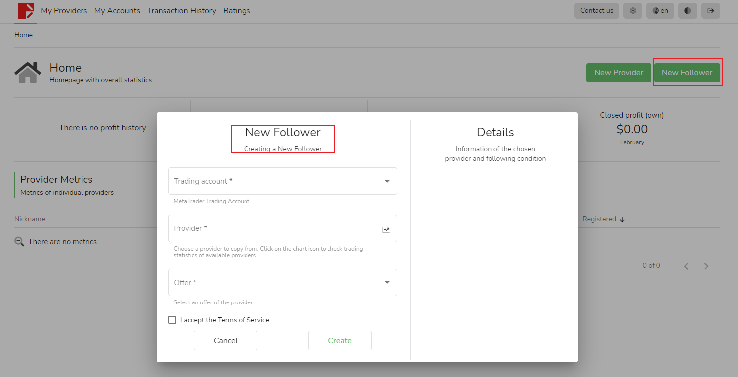 بعد تسجيل المتابع بنجاح ، انقر فوق [إضافة متابع] في أعلى يمين الصفحة الرئيسية ، ثم املأ [حساب التداول] و [مصدر الإشارة] و [نسخ الشروط] بدوره ، وحدد [أوافق على شروط الخدمة] .