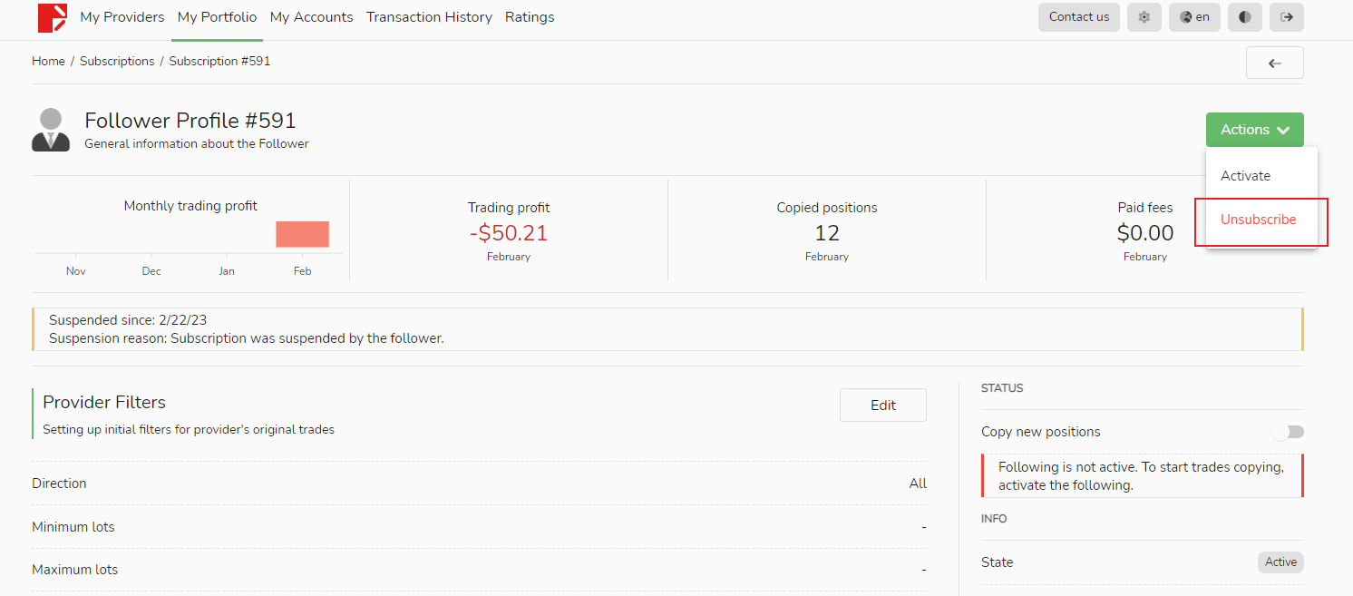 Si los seguidores quieren dejar de seguir, deben hacer clic en el botón rojo [Cancelar suscripción].