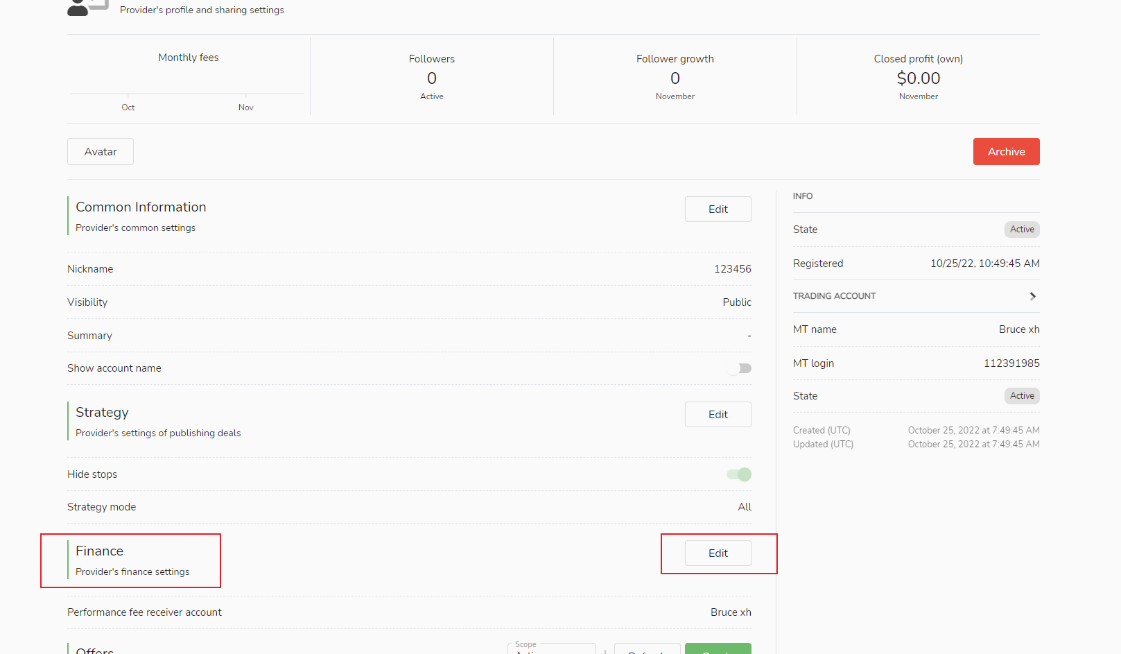 1. En la columna "Mis fuentes de señal", seleccione "Configuración de la cuenta del receptor de la tarifa de rendimiento" y haga clic en el botón "Editar".